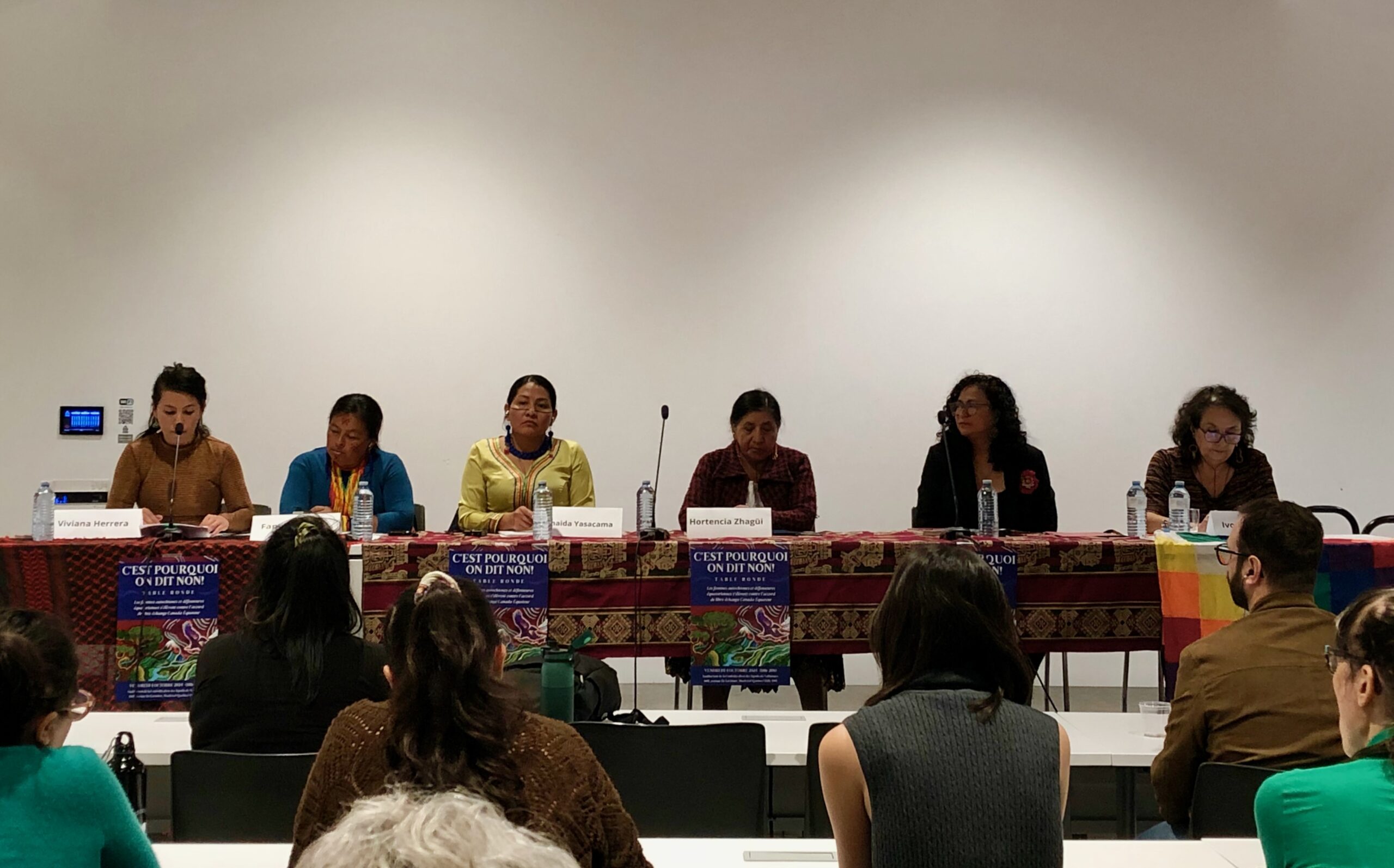 Une notion clé à la compréhension de la problématique des activités d’extraction menées sur les territoires des peuples autochtones amazoniens est celle du consentement préalable, libre et éclairé. Ce droit a été consacré en droit international en 2007 dans la Déclaration des Nations Unies sur les droits des peuples autochtones. Celle-ci stipule que le consentement des autochtones doit être octroyé préalablement à la réalisation de projets, de manière non forcée et en connaissance de cause. Malgré le fait que le Canada reconnaisse ce droit, les quatre femmes présentes à la table ronde ont insisté sur le fait qu’elles et leurs communautés n’ont jamais été informées de l’élaboration de l’accord de libre-échange avant d’en voir les conséquences.